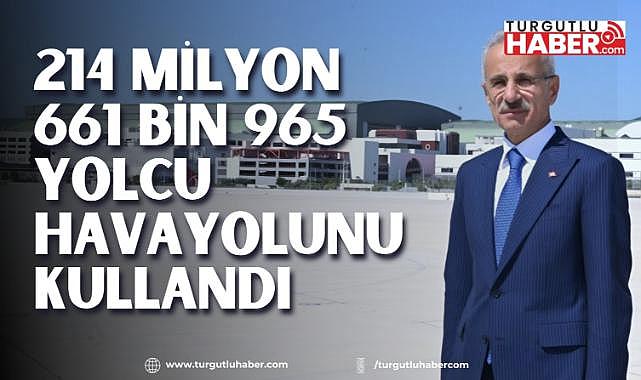 Ulaştırma ve Altyapı Bakanı Abdulkadir Uraloğlu, kasım ayında 16 milyon 328 bin 863 yolcunun hava yolu ile seyahat ettiğini bildirdi. Bakan Uraloğlu, “Ocak-Kasım döneminde havalimanlarımızın hizmet verdiği yolcu sayısı 214 milyon 661 bin 965’e ulaşırken taşınan yük ve kargo miktarı ise geçen yılın aynı dönemine göre yüzde 11,5 artarak 4 milyon 560 bin 816 ton olarak gerçekleşti.” dedi.Ulaştırma ve Altyapı Bakanı Abdulkadir Uraloğlu, Devlet Hava Meydanları İşletmesi (DHMİ) Genel Müdürlüğünün hava yolu uçak, yolcu ve yük verilerini değerlendirdi. Bakan Uraloğlu, kasım ayında 69 bin 652’si iç hatlar, 59 bin 167’si dış hatlar olmak üzere üst geçişlerle birlikte toplam 171 bin 55 uçak trafiğine ulaşıldığını bildirdi. Uraloğlu, “Uçak trafiği 2023 yılının kasım ayı ile kıyaslandığında, iç hatta 12,2; dış hatta yüzde 10 ve üst geçişler de dâhil toplam uçak trafiğinde yüzde 9,5 artış meydana geldi.” açıklamasında bulundu.