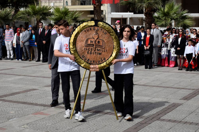 Turgutlu İlçe Milli Eğitim Müdürlüğü Çelenginin, İlçe Milli Eğitim Müdürü Mehmet Ölmez tarafından Atatürk Anıtı'na sunulmasıyla başlayan program saygı duruşu ve İstiklal Marşı'nın okunmasıyla devam etti.