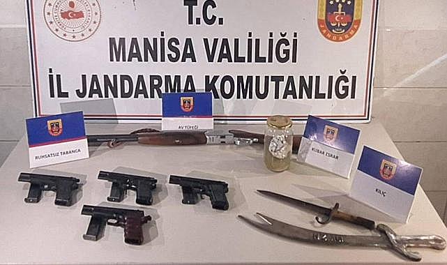Akhisar'da ruhsatsız av tüfeği, kılıç ve esrar ele geçirildi