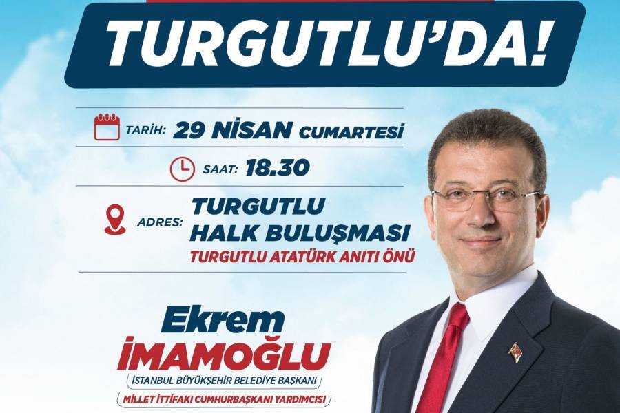 İstanbul Büyükşehir Belediye Başkanı ve Millet İttifakı Cumhurbaşkanı Yardımcısı Adayı Ekrem İmamoğlu, 29 Nisan Cumartesi günü saat 18:30’da Turgutlu halkıyla bir araya gelecek