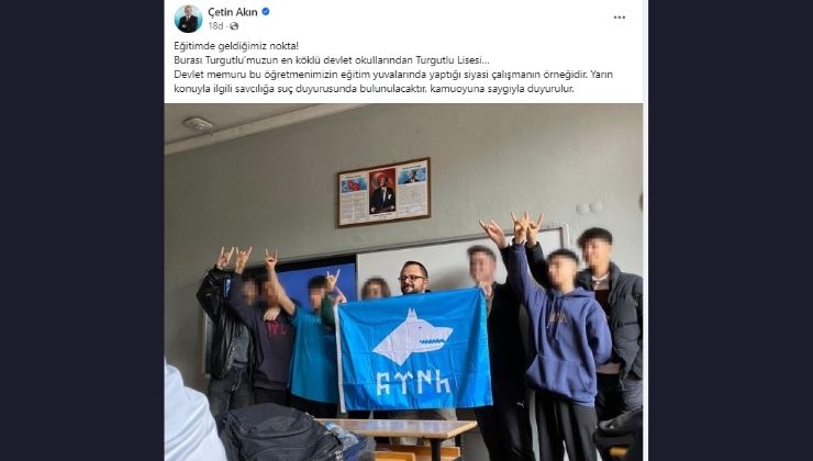 Turgutlu Belediye Başkanı Çetin Akın, Turgutlu'da bir lisede derste Göktürk Kağanlığı Bayrağı açan ve kurt işareti yapan öğrenciler ve eğitimcileri hakkında suç duyurusunda bulunacaklarını belirtti.