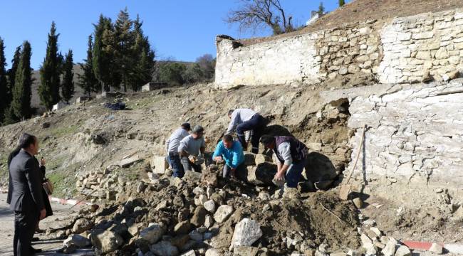 Manisa Büyükşehir Belediyesi Genel Sekreter Yardımcısı Metin Memiş, İzmir 2 Numaralı Kültür Varlıklarını Koruma Bölge Kurulu’nun izni kapsamında mezarlık çevre duvarlarının yenileme çalışmalarının baş