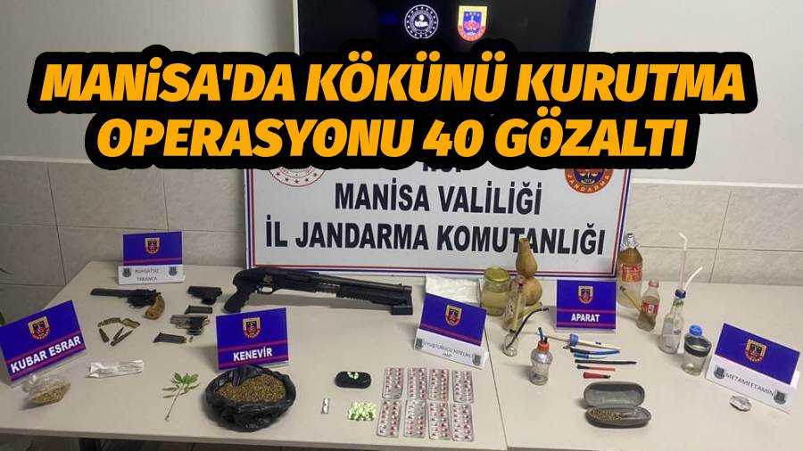 Jandarma'nın kökünü kurutma operasyonları kapsamında Yunusemre, Şehzadeler, Akhisar, Salihli, Alaşehir, Köprübaşı ve Sarıgöl İlçelerinde yapılan eş zamanlı operasyonlarda 40 şüpheli şahıs yakalanarak göz altına alındı.