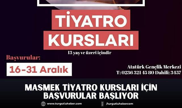 Manisa Büyükşehir Belediyesi Sanat ve Meslek Eğitimi Kursları (MASMEK) kapsamında düzenlenen tiyatro kursları için başvurular 16-31 Aralık tarihleri arasında Atatürk Gençlik Merkezi’nde alınacak.