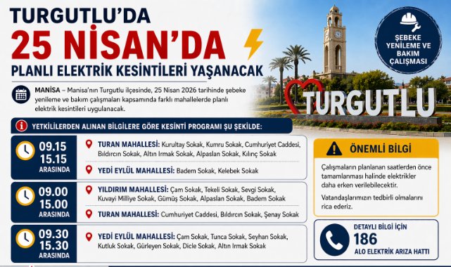 Manisa’nın Turgutlu ilçesinde, 25 Nisan 2026 tarihinde şebeke yenileme ve bakım çalışmaları kapsamında farklı mahallelerde planlı elektrik kesintileri uygulanacak.