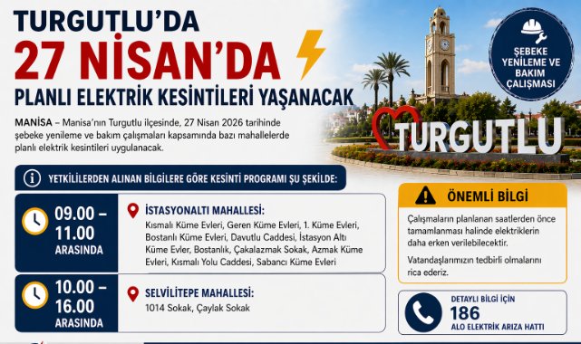 Manisa’nın Turgutlu ilçesinde, 27 Nisan 2026 tarihinde şebeke yenileme ve bakım çalışmaları kapsamında bazı mahallelerde planlı elektrik kesintileri uygulanacak.