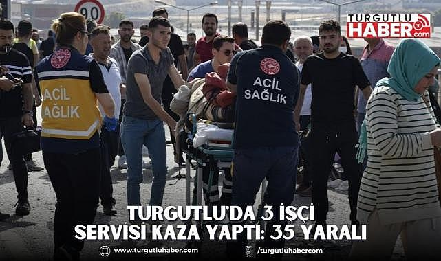 Manisa'nın Turgutlu ilçesinde fabrikalara personel taşıyan 3 servisin karıştığı trafik kazasında ilk belirlemelere göre yaklaşık 35 işçi yaralandı.