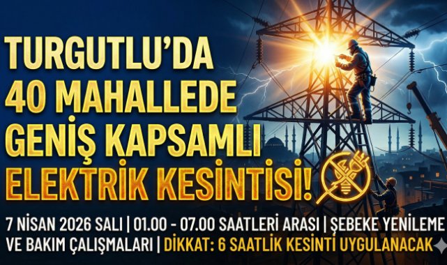 Manisa'nın Turgutlu ilçesinde 7 Nisan 2026 Salı günü şebeke yenileme ve bakım çalışmaları nedeniyle geniş kapsamlı elektrik kesintisi uygulanacak. GDZ Elektrik tarafından planlanan çalışmalar kapsamında 01.00 ile 07.00 saatleri arasında toplam 40 mahalle ve kırsal yerleşimde elektrik kesintisi yaşanacak.