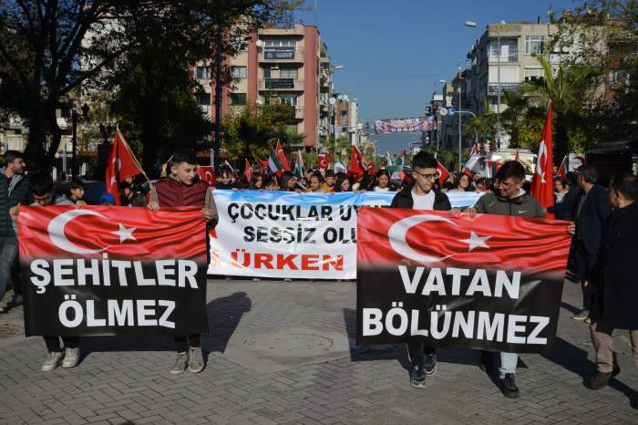 Ellerinde Filistin bayrağı ile yürüyen çocuk ve vatandaşlar ’Katil İsrail, Filistin’den Defol’ sloganları attı. Ellerinde dövizlerle İsrail’e tepki gösteren topluluğun yürüyüşü Belediye Binası önünden başlayıp 15 Temmuz Demokrasi Şehitleri Alanı’nda son buldu.