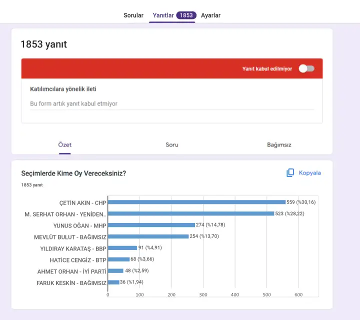 Anketimizin güvenlikli olması ve hileli cevaplar verilmemesi adına google üzerinden yapılan, gmail hesabı ile oy kullanımı yapılan ankette ise oy dağılımı şu şekilde oldu;