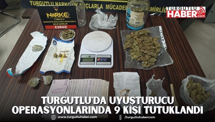 Manisa'nın Turgutlu ilçesinde uyuşturucu kullanan ve ticaretini yapanlara yönelik olarak yapılan operasyonlarda 9 kişi tutuklandı.Turgutlu Narkotik Suçlarla Mücadele Büro Amirliği, ilçe genelinde uyuşturucu veya uyarıcı madde ticareti yapan aracılık eden ve kullanan şahıslara yönelik operasyonlarına devam ediyor.